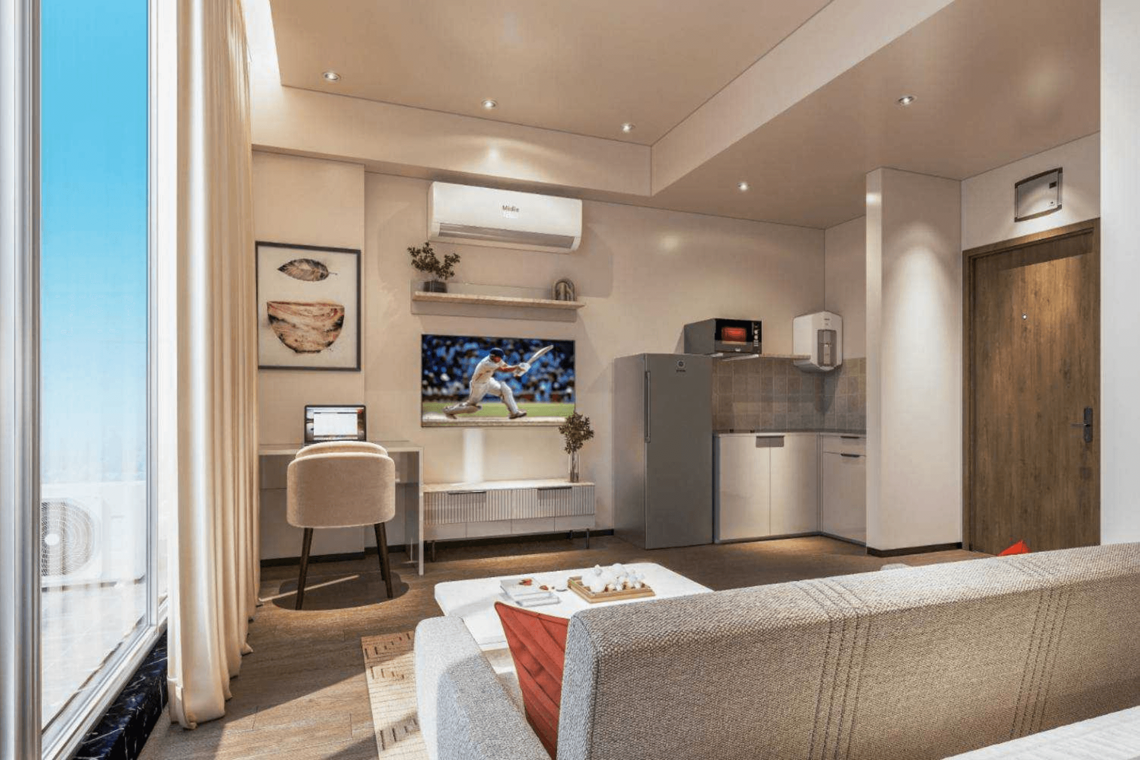 - Furnished Studio Apartments: Comes set up with a kitchenette, balcony, and combined